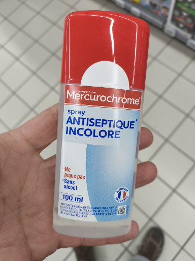 Mercurochrome is a well-known brand in France, recognized for its antiseptic products. The brand was originally founded in France and is now owned by Laboratoires Urgo, which continues to produce a range of personal care items, including antiseptic sprays. The product shown is a colorless antiseptic spray designed for skin disinfection, highlighting its alcohol-free formula, making it suitable for sensitive skin. The manufacturing of Mercurochrome products occurs in multiple countries, ensuring a broad distribution and availability.