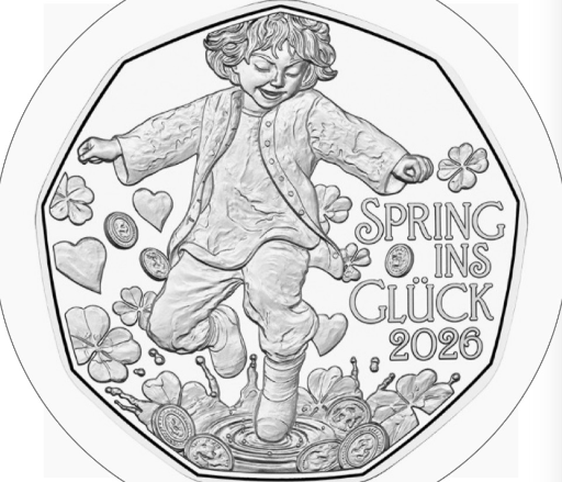 Die "Spring ins Glück" 2026 Gedenkmünze ist eine offizielle 5-Euro-Neujahrsmünze aus Österreich, die aus Silber (925/1000) gefertigt ist. Sie wurde von der Münze Österreich, der offiziellen Münzprägeanstalt der Republik Österreich, herausgegeben. Die Münze symbolisiert Mut, Zuversicht und Neubeginn und zeigt ein Kind, das fröhlich in eine Pfütze springt, wobei Wasser, Kleeblätter, Herzen und Münzen herausspritzen. Die Auflage ist auf 50.000 Exemplare weltweit limitiert. Die Münze wurde am 3. Dezember 2025 veröffentlicht und ist in der Qualität "Handgehoben" erhältlich. Sie wiegt 8,41 g und hat einen Durchmesser von 28,5 mm. Die Münze wird in einer zweisprachigen Verpackung mit "Prosit 2026"-Banderole angeboten.