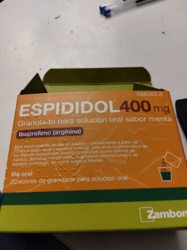 Espididol 400 mg is a pharmaceutical product manufactured by Zambon, primarily in Argentina. It is used for pain relief and contains ibuprofen as its active ingredient. Zambon Company, originally founded in Italy, is the ultimate owner of the brand, focusing on innovative healthcare solutions. The product is packaged in a box containing granules for oral solution with a mint flavor.