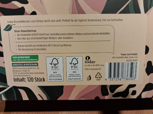 The product is a facial tissue branded as 'today', manufactured by Wepa Deutschland GmbH & Co. KG in Germany. These tissues are designed for daily use and are made from sustainable materials, ensuring they are free from fragrances and environmentally friendly. The packaging indicates that the product contains at least 80% recycled material, highlighting its commitment to sustainability. Wepa is recognized for its high-quality hygiene products across Europe.