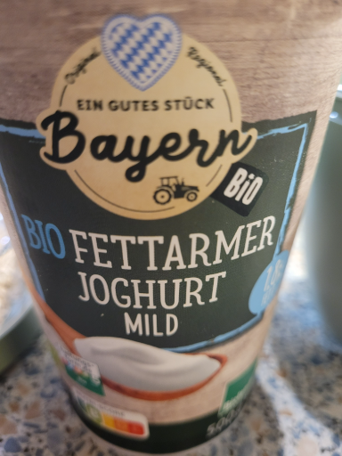 Bayern is a brand associated with dairy products, particularly yogurt. The product shown is a low-fat yogurt labeled as 'Bio Fettarmer Joghurt Mild', indicating it is organic. The brand is rooted in Germany, known for its high-quality dairy products. While specific company details are not available, the product is likely manufactured in multiple countries to meet demand and maintain quality standards.