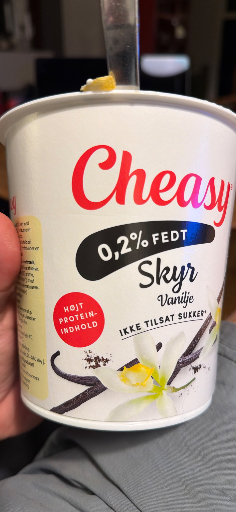 Cheasy Skyr Vanilje is a low-fat, high-protein dairy product with a creamy consistency and a vanilla flavor. It is produced by Arla Foods amba, a Danish-Swedish multinational cooperative specializing in dairy products. Arla Foods amba is owned by dairy farmers from Denmark, Sweden, the UK, Germany, Belgium, Luxembourg, and the Netherlands. The product is primarily manufactured in Denmark, but also produced in other locations. Cheasy Skyr Vanilje is marketed as a healthy snack option, suitable for breakfast, between meals, or as a late-night treat. It contains no added sugar and is low in fat, making it a popular choice among health-conscious consumers.
