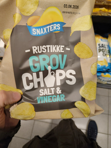 Snaxters is a brand known for its snack products, particularly potato chips. The Grov Chips Salt & Vinegar variant is a popular flavor among consumers. The product is packaged in a distinctive bag that highlights its rustic style and flavor profile. While the exact manufacturing details are not specified, it is common for snack products to be produced in multiple countries to meet demand and distribution needs. The brand originates from Denmark, reflecting the local taste preferences in its product offerings.