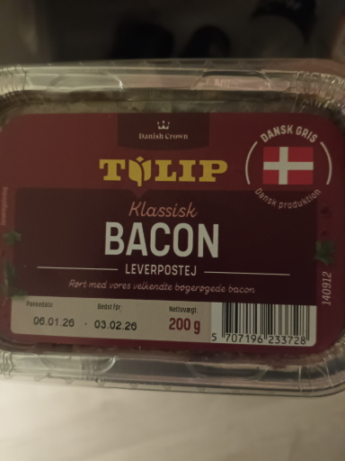 Tulip is a well-known brand in Denmark, particularly recognized for its meat products, including bacon and pâté. The brand is owned by Danish Crown, a major player in the meat industry, which emphasizes quality and local production. The product, Klassisk Bacon Leverpostej, is a traditional Danish pâté made with bacon, reflecting the brand's commitment to using high-quality ingredients sourced from Danish farms.