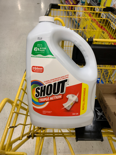 Shout is a well-known brand of stain remover that is part of the SC Johnson family of products. Founded in the United States, SC Johnson has been a leader in household cleaning solutions for many years. The Shout Triple Action formula is designed to clean, penetrate, and lift stains from fabrics, making it a popular choice for consumers looking to tackle tough stains. The product is packaged in a bottle made with 45% recycled plastic, reflecting the brand's commitment to sustainability. Shout is manufactured in multiple countries to meet global demand.