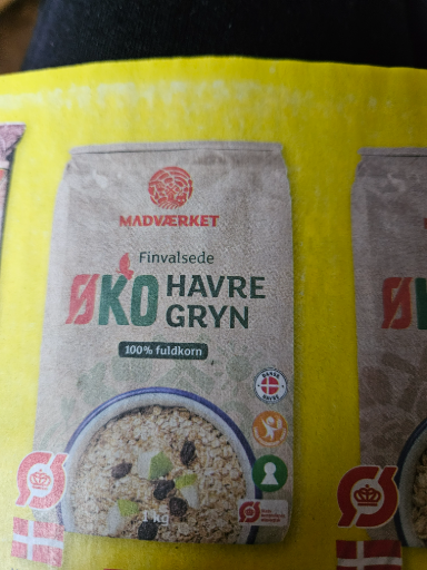 MADVÆRKET is a Danish brand known for its organic food products, including oats. The product shown is ØKO HAVRE GRYN, which translates to organic oat flakes. The packaging indicates that it is made from 100% whole grain oats. The brand emphasizes quality and sustainability, aligning with the growing demand for organic food options. While the specific manufacturing country is not detailed, it is common for such products to be sourced from multiple countries to ensure quality and availability.