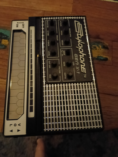 The Dubreq Stylophone Gen X-1 is a modern iteration of the classic 1960s Stylophone, a portable analog synthesizer. Dubreq Ltd., the original UK-based company behind the Stylophone, continues to manufacture and sell the Gen X-1. This model features a stylus keyboard, separate sound strip, LFO with square and triangle waves, low-pass filter with cutoff and resonance controls, sub-octave switches, envelope controls, delay effects, and pulse-width modulation. It operates on batteries and includes a built-in speaker, making it suitable for both beginners and professional musicians seeking a compact and versatile synthesizer. (bhphotovideo.com)