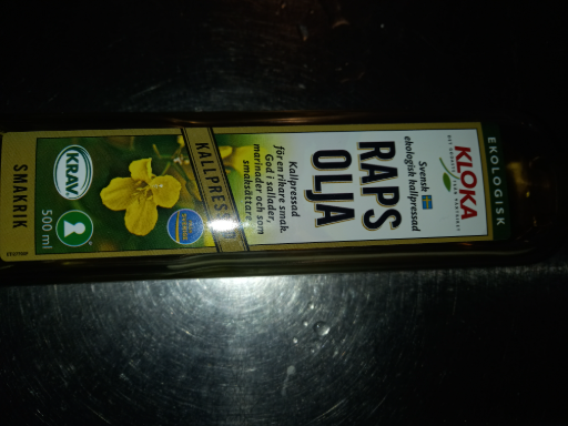Kloka Rapsstekolja Smörsmak 500ml is a Swedish cooking oil developed for frying, with a butter flavor. It is also suitable for baking, dressings, and glazes. The oil is produced by Heba Food & Beverages AB, a Swedish company specializing in food and beverage products. The Kloka brand offers various rapeseed oils, including neutral and flavored options, all produced in Sweden. The company emphasizes the use of high-quality Swedish rapeseed and sustainable production methods. The product is available in a 500ml glass bottle and is free from lactose and milk, making it suitable for vegans and vegetarians. The oil is rich in unsaturated fats and omega-3 fatty acids, contributing to a healthy diet.