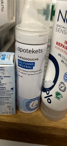 Apotekets Næsespray Saltvand Neutral is a nasal spray containing a 0.9% saltwater solution, matching the natural salt concentration of the body. It is used to gently cleanse the nasal passages, reduce mucus production during rhinitis, moisturize dry nasal mucosa, and protect against drying out. The product is suitable for daily nasal hygiene and can be used by adults and children from 2 years old, including pregnant and breastfeeding women. Apotekets is a Danish pharmacy chain, Apoteket Danmark A/S, which owns and operates the brand, offering a variety of health and pharmaceutical products across Denmark.
