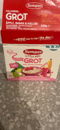 Semper Fullkornsgröt Äpple, Banan & Hallon är en fullkornspröjd för småbarn (avsedd för cirka 1–3 år) som säljs i 500 g förpackningar på den nordiska marknaden. (mathem.se)