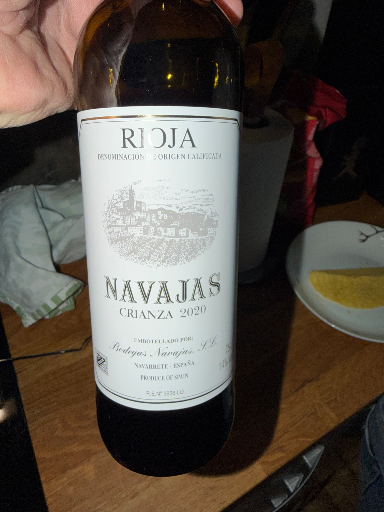 Kortfattat: flaskan på bilden är Navajas Crianza (årgång 2020), en röd Rioja från Spanien, producerad och buteljerad av den familjeägda Bodegas Navajas S.L. i Navarrete, La Rioja. Detta stöds av bodegaens egna beskrivningar och flera internationella återförsäljare som listar samma cuvée och årgång. (bodegasnavajas.info)
