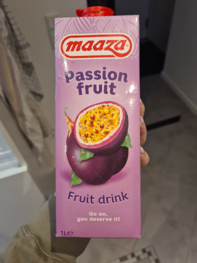 The pictured product is Maaza Passion Fruit in a 1 L carton — a ready-to-drink passion fruit fruit drink/nectar sold under the Maaza label. Maaza’s own product pages list a passion-fruit 1 L carton and state the passion fruit supply (concentrate) sources used for that product; the Maaza/EnjoyMaaza European site and retail listings show this 1 L carton format and Dutch distribution details. (enjoymaaza.com)