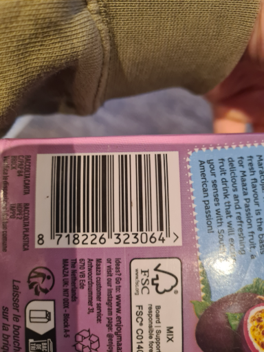 Summary: Maaza Passion Fruit Juice Drink (1 L) — Beverage (fruit juice drink) — barcode 8718226323064 — primarily manufactured in the Netherlands, brand origin India (Parle), ultimate owner The Coca‑Cola Company (USA), local packer Infra Foodbrands BV.