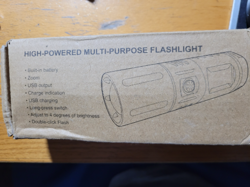 The pictured item is a generic, unbranded "High-Powered Multi-Purpose Flashlight" — a rechargeable, zoomable LED handheld torch with USB output and multi-mode brightness features, matching the product features printed on the box (built-in battery, zoom, USB output, charge indication, USB charging, long-press switch, adjustable brightness, double-click flash).