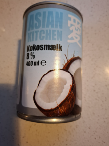 Produktet på billedet er en dåse kokosmælk med mærkningen "ASIAN KITCHEN" og teksten "Kokosmælk 8% 400 ml". Dette er en færdigvare beregnet som madvare/tilberedningsingrediens — en canned coconut milk beregnet til madlavning.