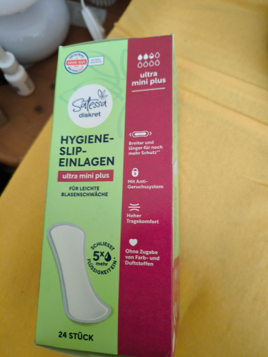 Satessa Hygiene-Slipeinlagen Ultra Mini Plus ist eine Eigenmarke-Hygieneeinlage, vermarktet unter der Satessa / "Diskret" Range bei ALDI. Die Produktbezeichnung, Anwendung (für leichte Blasenschwäche) und Verpackungsgröße (z. B. 24 Stück) entsprechen der Satessa Ultra Mini Plus-Variante, wie sie bei ALDI geführt wird. (supermarktcheck.de)