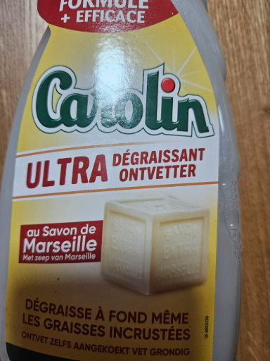 Carolin Ultra Dégraissant au Savon de Marseille is a ready-to-use household degreasing spray marketed under the Carolin brand. The product is formulated around Savon de Marseille (Marseille soap) and positioned for kitchen and heavy grease removal on multiple surfaces (oven, hobs, filters, grills, bins, etc.).