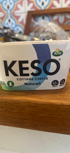 Sammanfattningsvis är produkten på bilden KESO Cottage Cheese (Naturell) — en svenskproducerad cottage cheese som marknadsförs under Arla-varumärket, ursprungligen lanserad av Mjölkcentralen och i dag ägd och distribuerad av Arla Foods (genom Arla Sverige på den svenska marknaden). Produktionskapaciteten för KESO är koncentrerad till Arlas Falkenberg-mejeri i Sverige. (arla.se)