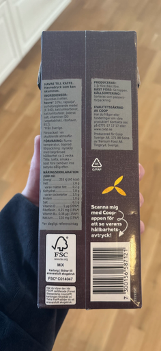 Coop – Havredryck Till Kaffe är Coops egen barista‑anpassade havredryck, avsedd för kaffe (kan värmas, skummas och ge bra textur i espresso‑baserade drycker). Förpackningsdesignen visar Coops nya grafiska uttryck och en uppmaning att scanna varan med Coop-appen för hållbarhetsinformation, vilket stämmer med Coops lansering och uppdatering av sina havredrycker. (pressrum.coop.se)