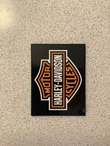 Billedet viser et stykke officielt Harley‑Davidson merchandise med det klassiske "Bar & Shield"-logo; det er et typisk design for køleskabsmagneter eller små tin/rubber-magneter solgt gennem Harley‑Davidson butikker og autoriserede forhandlere. (wisconsinharley.com)