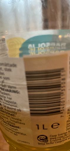 Billedet viser en 1-liters flaske mærket "Coop" og tekst der indikerer "1 L" og "Coop Sverige" — dette stemmer overens med Coops private-label rapsolja/rapsolie, solgt som "Coop Rapsolja 1 L" i de nordiske butikker. (wolt.com)