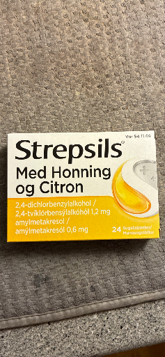 Strepsils Med Honning og Citron is the Danish-market packaging of the well-known Strepsils Honey & Lemon lozenge — an over-the-counter throat lozenge containing the antiseptic active ingredients 2,4-dichlorobenzyl alcohol and amylmetacresol used for symptomatic relief of sore and irritated throats. (medicines.org.uk)