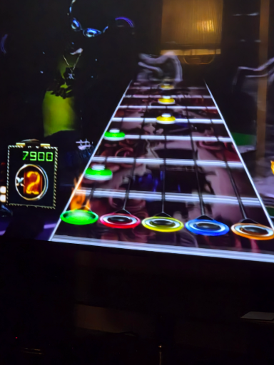 This is a gameplay screenshot from the Guitar Hero series: a five-lane "note highway" (green, red, yellow, blue, orange) with incoming notes and an on-screen score/multiplier. The visible UI and colored fret notes identify it as Guitar Hero-style rhythm gameplay played with a guitar-shaped controller.