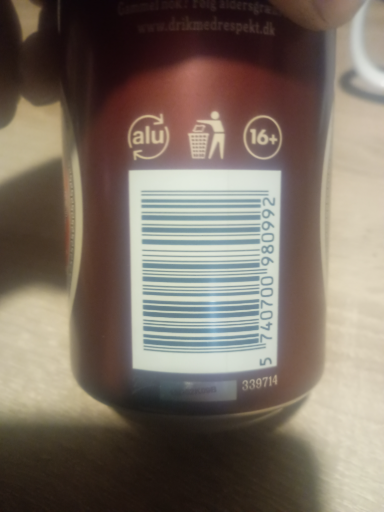 The barcode on the can begins with the EAN prefix 574 (country prefix range 570–579), which is assigned to Denmark (and related GS1 national allocation). This supports that the can's EAN was issued in Denmark. (strokescribe.com)