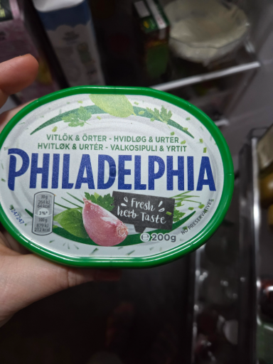 This item is Philadelphia cream cheese — the Garlic & Herbs (vitlök & örter / hvidløg & urter / valkosipuli & yrtit) spread in a green-lidded 200 g tub. The multi-language front label (Nordic languages) and the prominent PHILADELPHIA wordmark identify it as the branded flavoured cream-cheese spread sold in Northern European markets.