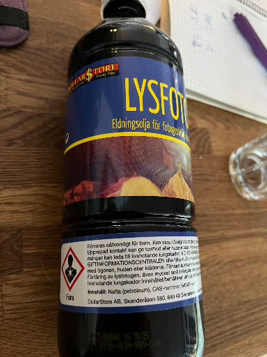 Flaskan på bilden är en privatmärkt eldningsolja / lysfotogen (stor text "LYSFOT" och undertext "Eldningsolja för fotogen") som bär DollarStore-logotypen — alltså en DollarStore private‑label-vara avsedd som fotogen/eldningsolja för lampor, värmare och liknande. (seasea.se)