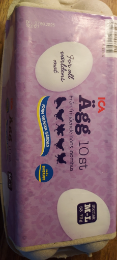 The product is ICA-branded fresh shell eggs sold as a 10-pack (Ägg 10st), labelled as medium–large (M–L) and described on retailer product pages as Swedish eggs from barn/free-range indoor hens. (handla.ica.se)