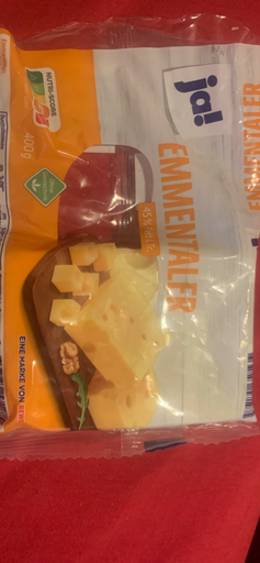 Die abgebildete Packung ist "ja! Emmentaler" (Hartkäse), mind. 45% Fett i.Tr., im 400‑g‑Format — ein Eigenmarken‑Produkt der REWE‑Gruppe. (artikel.selgros.de)