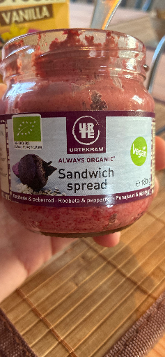 This jar is Urtekram's "Sandwich spread" in a beetroot (röd) variety — clearly labelled with the Urtekram logo, the "Always Organic" tagline, the EU organic leaf mark and a "vegan" badge. The vivid pink colour and small Swedish-language flavour text visible on the label indicate a beetroot & horseradish style spread.