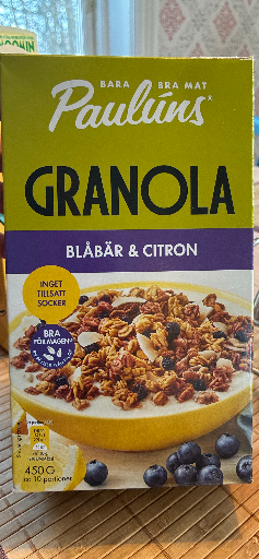 Sammanfattning: Produkt — Paulúns Granola Blåbär & Citron; Produktkategori — Granola/frukostblandning; Tillverkningsland — Danmark; Varumärke ursprung — Sverige (Paulúns), nu ägt och distribuerat av Orkla via Orkla Foods Sverige AB. (pauluns.se)