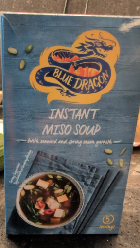 Blue Dragon Instant Miso Soup is an instant miso soup product sold under the Blue Dragon brand. The pack format typically contains individual sachets of miso paste plus separate garnish sachets (seaweed/wakame and spring onion) and is commonly sold as a multi‑serving box (the pictured box indicates 5 servings).