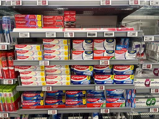 Billedet viser en detailhylde med Colgate-tandpastaprodukter — flere varianter ses typisk i supermarkeder (f.eks. Colgate Total, MaxFresh, Whitening/White, Sensitive og 2in1/MaxFresh-typer). Dette er Colgate-mærkets tandpastaer, altså mundplejeprodukter under Colgate-brandet.