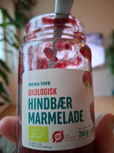 REMA 1000 Økologisk Hindbær Marmelade is an organic raspberry jam sold under the REMA 1000 private label. It is primarily produced/packed for the Danish market (Danish organic certification shown on the label) and the REMA 1000 brand originates from Norway and is ultimately owned by Reitangruppen AS (Norway).