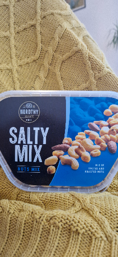 Nordthy Salty Mix ist eine gesalzene Nussmischung (Peanuts, Mandeln, Cashew u. a.) unter der Marke Nordthy, angeboten in mehreren Packungsgrößen. Die Produktseiten und Shop-Listings zeigen das gleiche Design und Produktnamen („Salty Mix“) wie auf dem Foto. (nordthy.com)