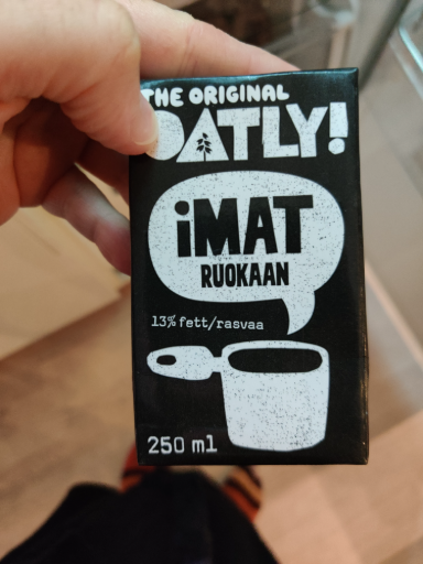 Oatly iMat Ruokaan 13% (250 ml) is an oat-based cooking cream sold as a plant-based alternative to dairy cooking creams and crème fraîche. The product is formulated for use in hot and cold dishes (the Finnish label "iMat ruokaan" indicates "for cooking/food") and is marketed as lactose-free, milk-free and vegan. The 13% fat formulation makes it suitable as a one-to-one swap for traditional light cooking creams.