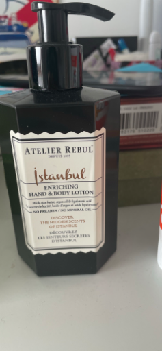 Identification basée sur le visuel du packaging (libellé « Atelier Rebul », « Istanbul », « Enriching Hand & Body Lotion ») et sur les informations publiques commerciales et de marque concernant Atelier Rebul et Rebul en Turquie.