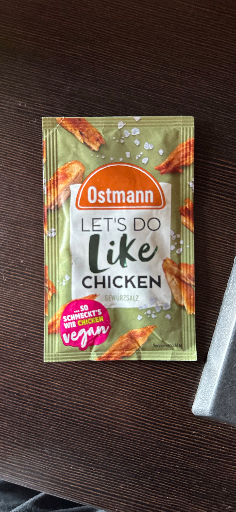 Das Foto zeigt ein einzelnes Portionspäckchen "Ostmann — LET'S DO Like Chicken" (Aufschrift: "Gewürzsalz"). Es handelt sich um ein veganes, herzhaftes Gewürz-/Würzsalz, das speziell dafür entwickelt wurde, pflanzlichen Zutaten einen „Chicken“-ähnlichen Geschmack zu verleihen. Damit ist es genau ein Food‑Produkt der Unterkategorie "Seasoning / Spice mix" (Würzmischung, Gewürzsalz) — nicht ein Fertiggericht oder Marinade.
