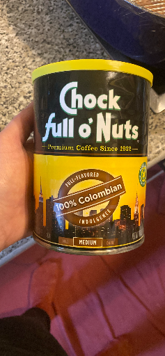 This can is Chock full o' Nuts 100% Colombian ground coffee, labeled as a medium roast and sold in the brand's signature steel can packaging (100% Colombian — Medium). (chockfullonuts.com)