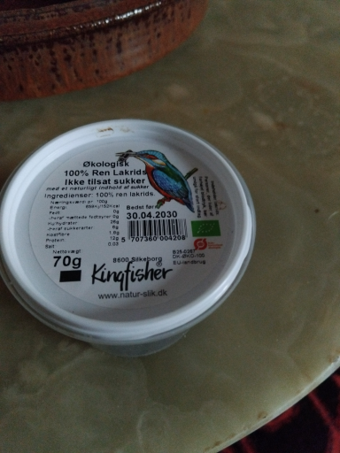 Kingfisher 100% Ren Lakrids (70 g) er en økologisk, 100% ren rå-lakrids vare i en lille plastbøtte, markedsført under Kingfisher-navnet af Coala's Naturprodukter (natur-slik.dk). EAN/Barcode registreres som 5707360004208 for denne 70 g-variant. (naturoghelse.dk)