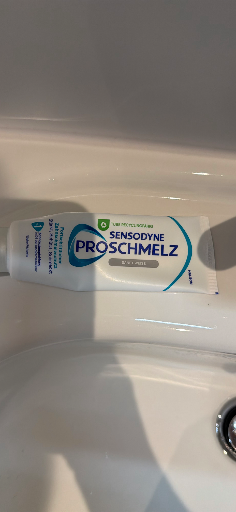The photo shows a tube of Sensodyne ProSchmelz — Sensodyne's enamel-protection / sensitive-teeth toothpaste line marketed in German-speaking markets (the packaging and ProSchmelz name identify this variant).