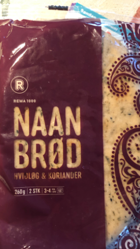 REMA 1000 Naanbrød (Hvidløg & Koriander) is a private-label frozen/refrigerated naan flatbread sold under the REMA 1000 brand in Denmark. The product is marketed as a 260 g pack (2 x 130 g) of naan flavored with garlic and coriander. REMA 1000 is a Norwegian discount supermarket chain founded by Odd Reitan and is part of the Reitangruppen (Reitan Group). The product carries a Danish EAN (570...), indicating Danish registration/market placement, and is commonly listed in Danish product databases and retailer listings — supporting Denmark as the manufacturing/market origin for this SKU. Ownership and brand control rest with Reitangruppen, a Norway-headquartered retail group; locally the product is distributed and managed by REMA 1000 Denmark / Reitan Retail. This summary describes brand origin, typical manufacturing/market origin, and current ultimate ownership for use in product-origin and supply-chain contexts.
