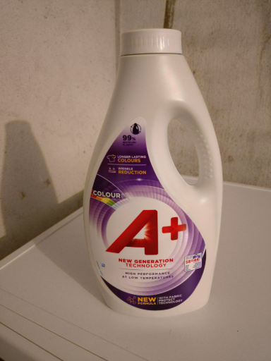 A+ Colour Laundry Detergent is a liquid laundry detergent marketed under the A+ brand (labelled with the large red “A+” and “New Generation Technology” wording). The pictured SKU is the colour‑care liquid variety designed for coloured garments and low‑temperature washing.