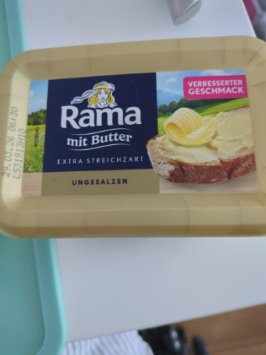 Rama mit Butter (ungesalzen) ist ein extra-streichzarter Brotaufstrich / Streichfett (Margarine‑/Streichfett-Produkt) auf Basis pflanzlicher Öle mit 9% Butter, erhältlich in Bechern (z. B. 225 g und 400 g). (rama.com)