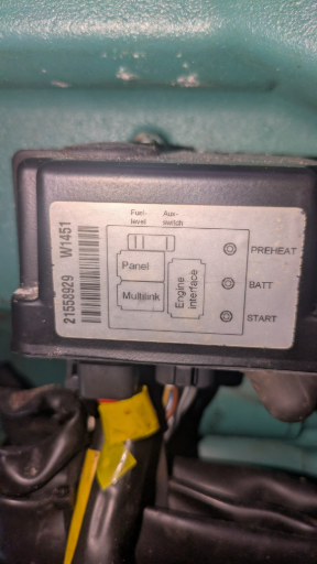 The photographed box is consistent with a Volvo Penta MDI / engine interface module used in Volvo Penta EVC systems: the printed connector labels “Panel”, “Multilink” and “Engine interface” and the indicator legends (PREHEAT, BATT, START) match Volvo Penta’s MDI/HIU wiring and Multilink architecture described in Volvo Penta service documentation and hands‑on reports. (studyres.com)
