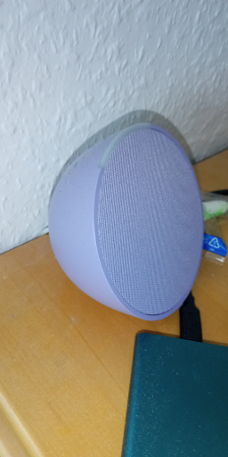 The photographed item appears to be a small, triangular/puck-shaped portable Bluetooth speaker with a fabric-covered front grille. There is no visible brand logo, model name, label, or barcode on the exposed surfaces in the image, so a precise product or brand identification is not possible from this photo alone.