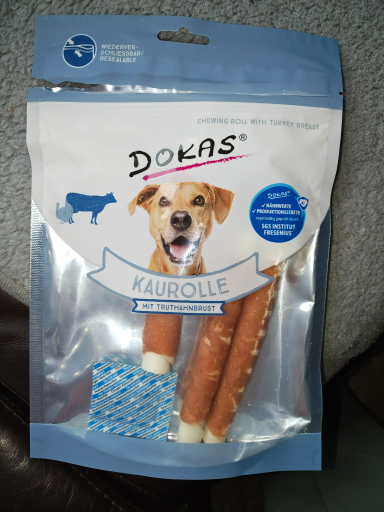 Die gezeigte Verpackung ist die "DOKAS Kaurolle mit Truthahnbrust" — ein kaubarer Hundesnack (feine Rinderhautstäbchen, mit Truthahnbrust umhüllt), verfügbar in z. B. 190 g Packungen; das Produkt wird mit der GTIN 4251276204920 gelistet. (dokas.eu)